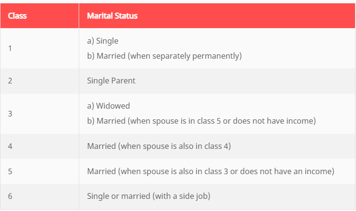 La tranche d’imposition dépend principalement de la situation familiale. Il existe six classes différentes qui déterminent le montant de l’impôt retenu.