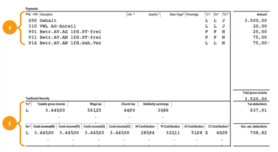 Le bulletin de paie allemand expliqué : il est déterminant pour le calcul de l’impôt sur le revenu. Du salaire brut au salaire net, toutes les allocations et déductions sont incluses. En Allemagne, les déductions couvrent l’impôt sur le revenu, l’impôt ecclésiastique, la contribution de solidarité et les cotisations sociales telles que la cotisation HI Allemagne (assurance maladie), la cotisation PI Allemagne (assurance retraite), l’assurance chômage et l’assurance dépendance. La structure est fondamentalement toujours la même. Décomposons un bulletin de paie allemand général en trois parties.