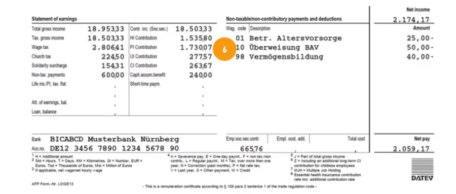 Les cotisations santé et soins peuvent apparaître ici si certains seuils salariaux sont atteints. Par exemple, l’allocation ER HI (allocation patronale pour l’assurance maladie) peut être indiquée ici, à côté de la cotisation PI ou d’autres ajustements. Un autre terme courant est « HI add on Germany », qui désigne les primes supplémentaires dépendant de la caisse d’assurance maladie.