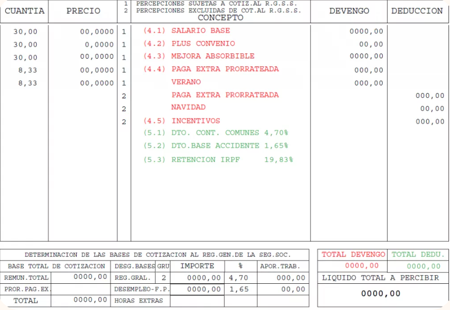 2. BCCC : Salaire de base + Compléments salariaux soumis à cotisation + Répartition des paiements supplémentaires. Bien que le travailleur facture les paiements supplémentaires aux moments prévus dans son contrat, cette répartition est nécessaire, car la sécurité sociale facture au mois. Dans les contingences communes, elle représente 24,10 % de la base de contingence commune du travailleur.