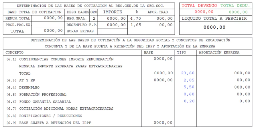 4. Ce montant est calculé en additionnant la BCCC + la valeur des heures supplémentaires. Il s’agit de la base de cotisation utilisée pour calculer le pourcentage de la base des accidents du travail, du chômage, de la formation professionnelle et du Fonds de garantie salariale (FOGASA).