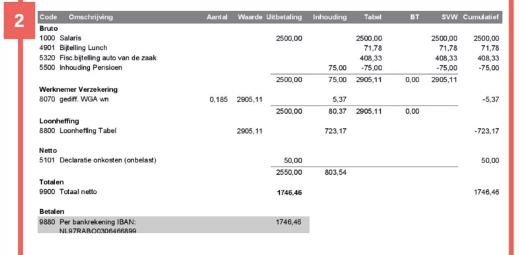 La partie centrale du bulletin de paie indique exactement comment le salaire net est calculé. Les montants de la colonne « Inhouding » indiquent si un certain élément du salaire fait partie du salaire sur lequel l’employé paie des cotisations sociales, et dans la colonne « SVW », vous pouvez voir quelle partie l’employeur doit payer en termes de cotisations d’assurance sociale.