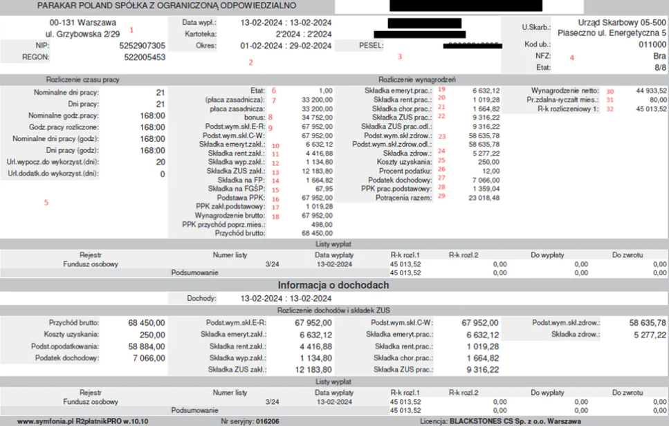 Vous trouverez ci-dessous un exemple de fiche de paie polonaise où chaque élément est numéroté et expliqué.